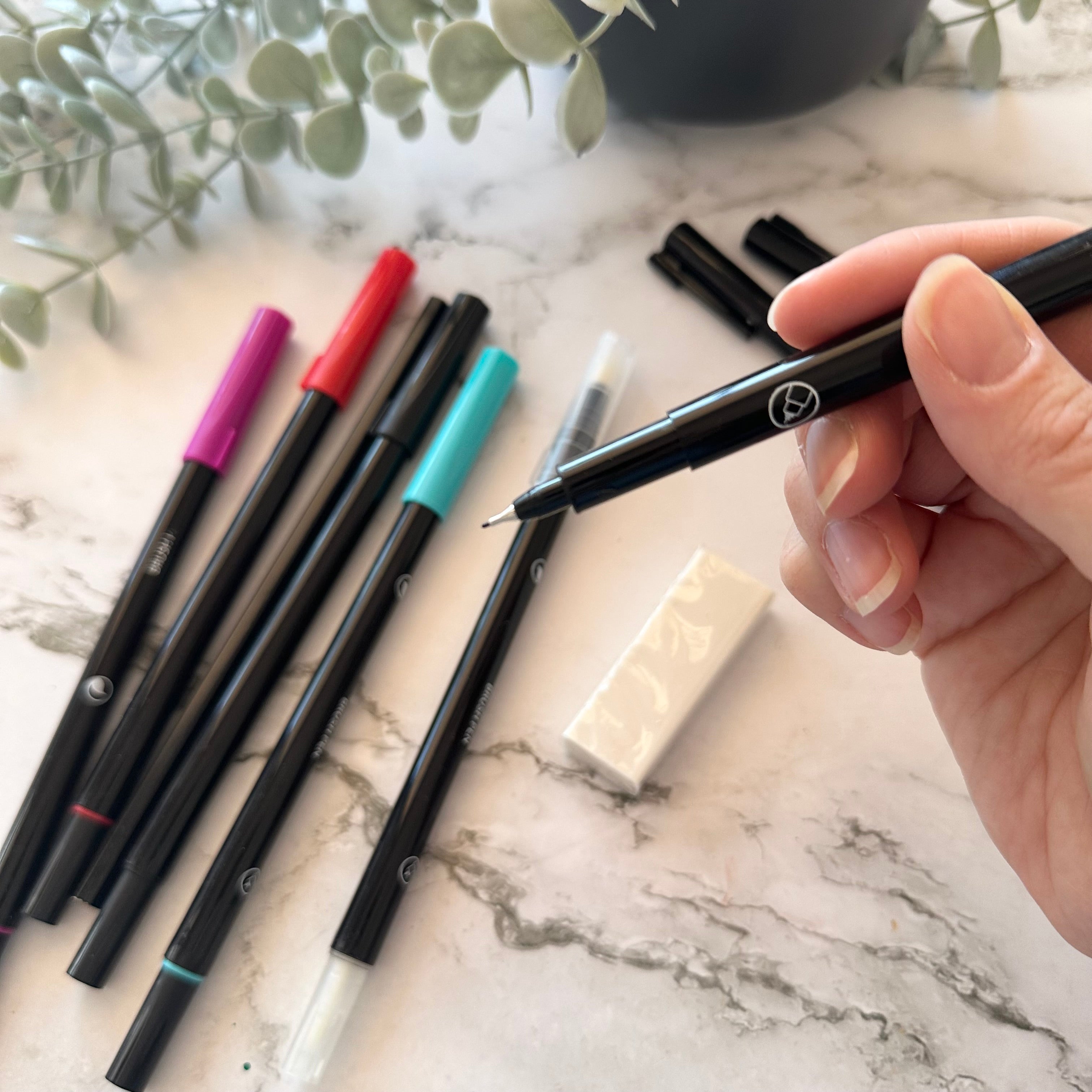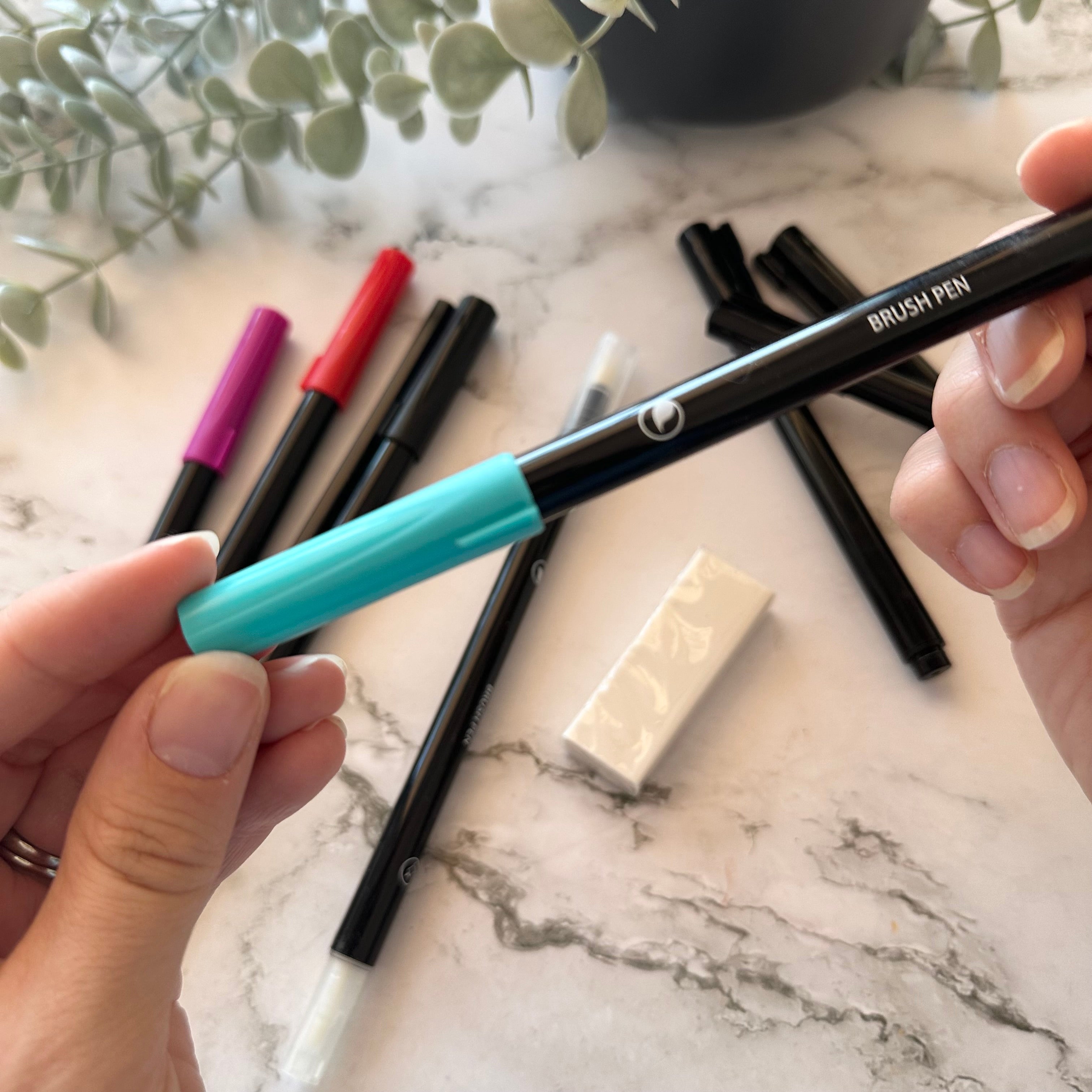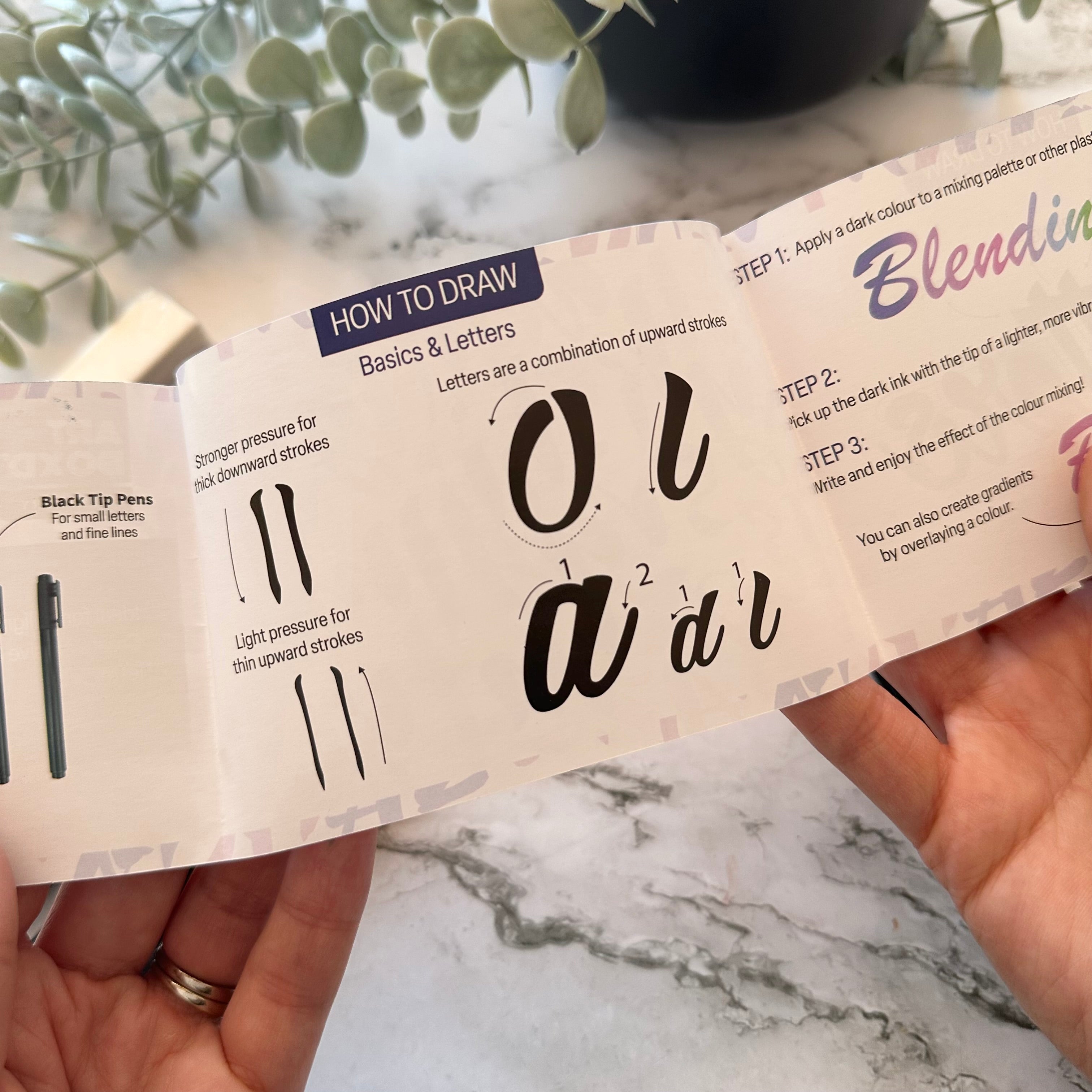 Inside the set you’ll find four dual brush pens (black, red, magenta, and turquoise), a colourless blender pen, two black fineliners, a black medium tip pen, plus a drawing pencil and eraser. A simple step-by-step guide is included to walk you through the basics of lettering, making this an ideal set for beginners, planners, and anyone wanting to add creative lettering to their pages.