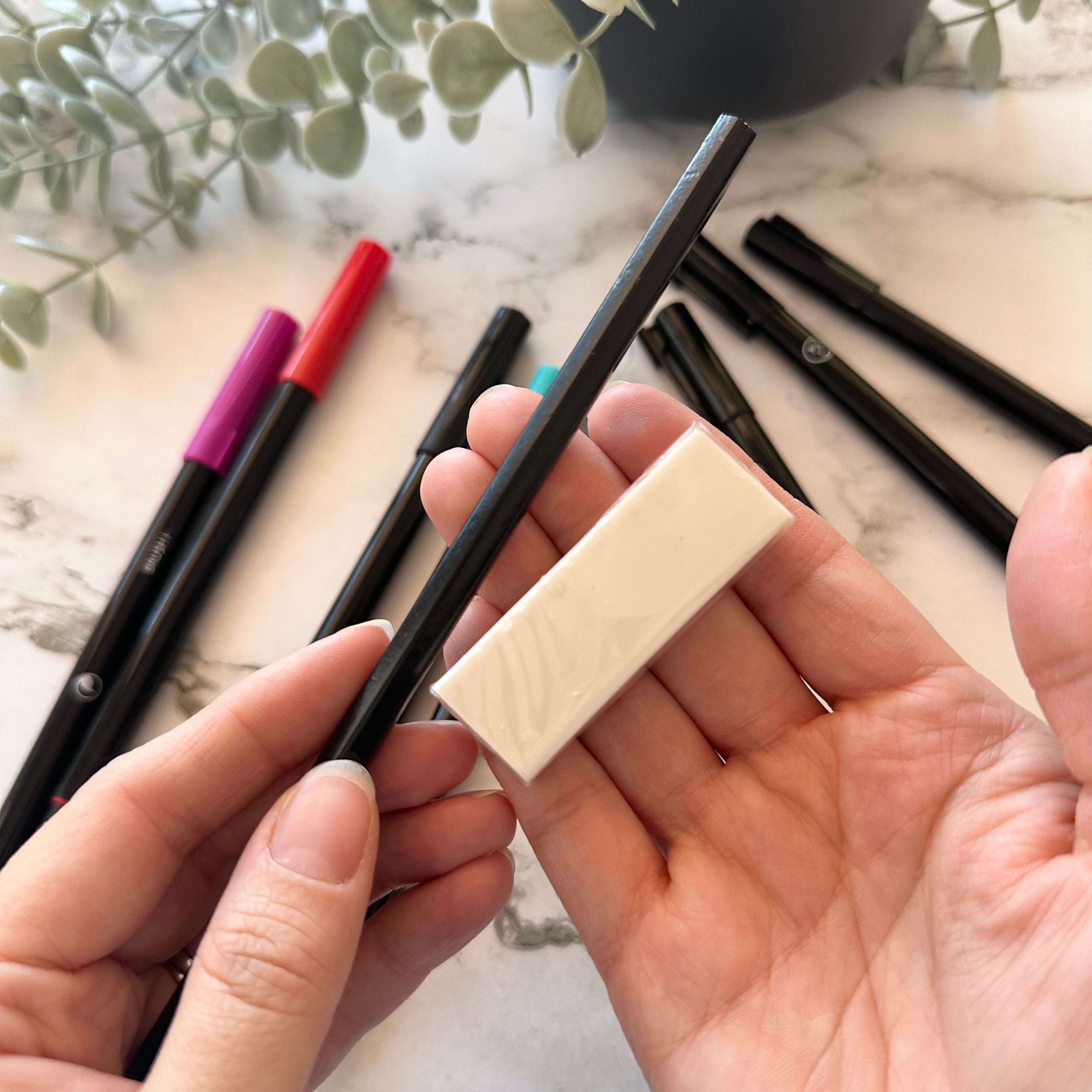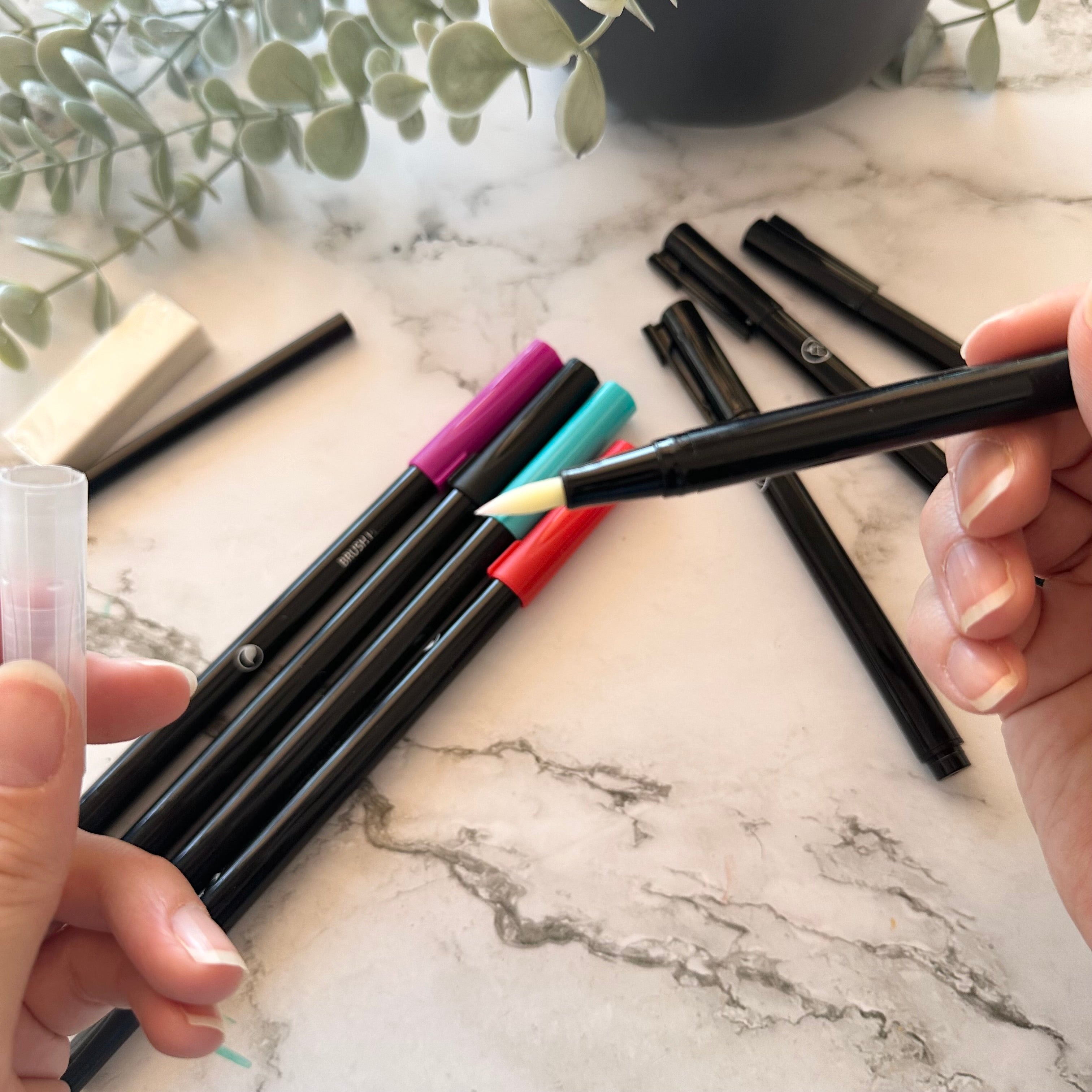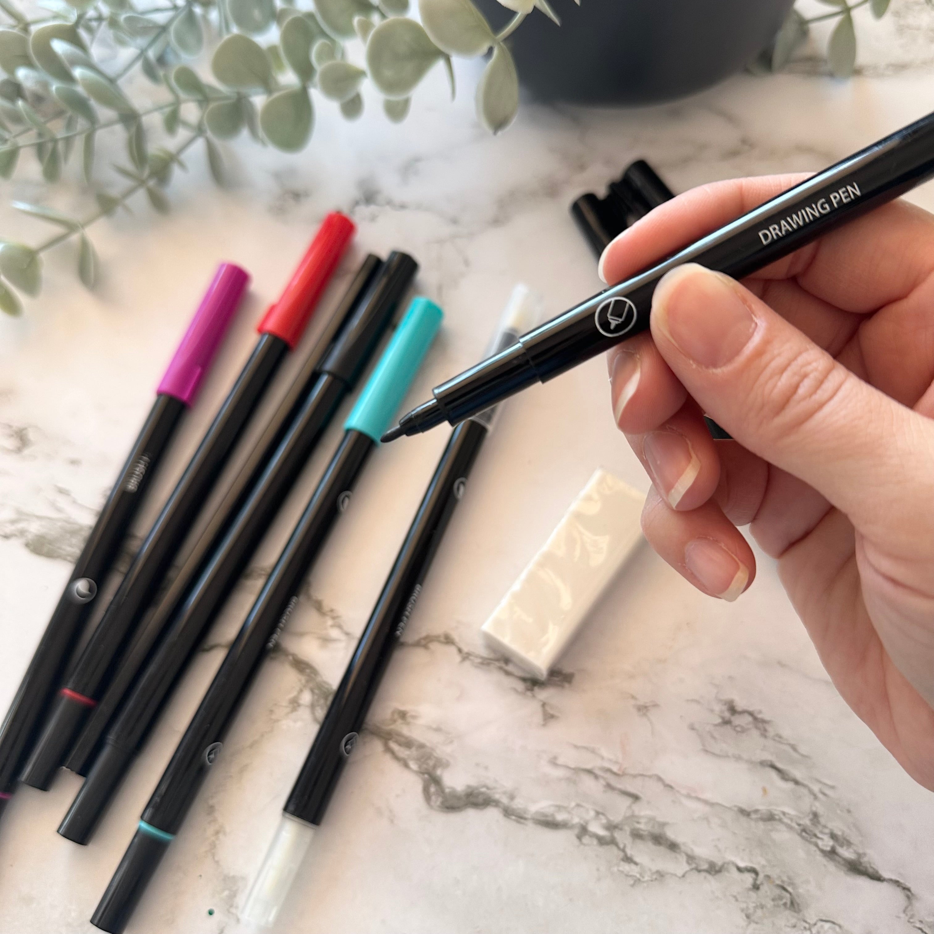 Inside the set you’ll find four dual brush pens (black, red, magenta, and turquoise), a colourless blender pen, two black fineliners, a black medium tip pen, plus a drawing pencil and eraser. A simple step-by-step guide is included to walk you through the basics of lettering, making this an ideal set for beginners, planners, and anyone wanting to add creative lettering to their pages.