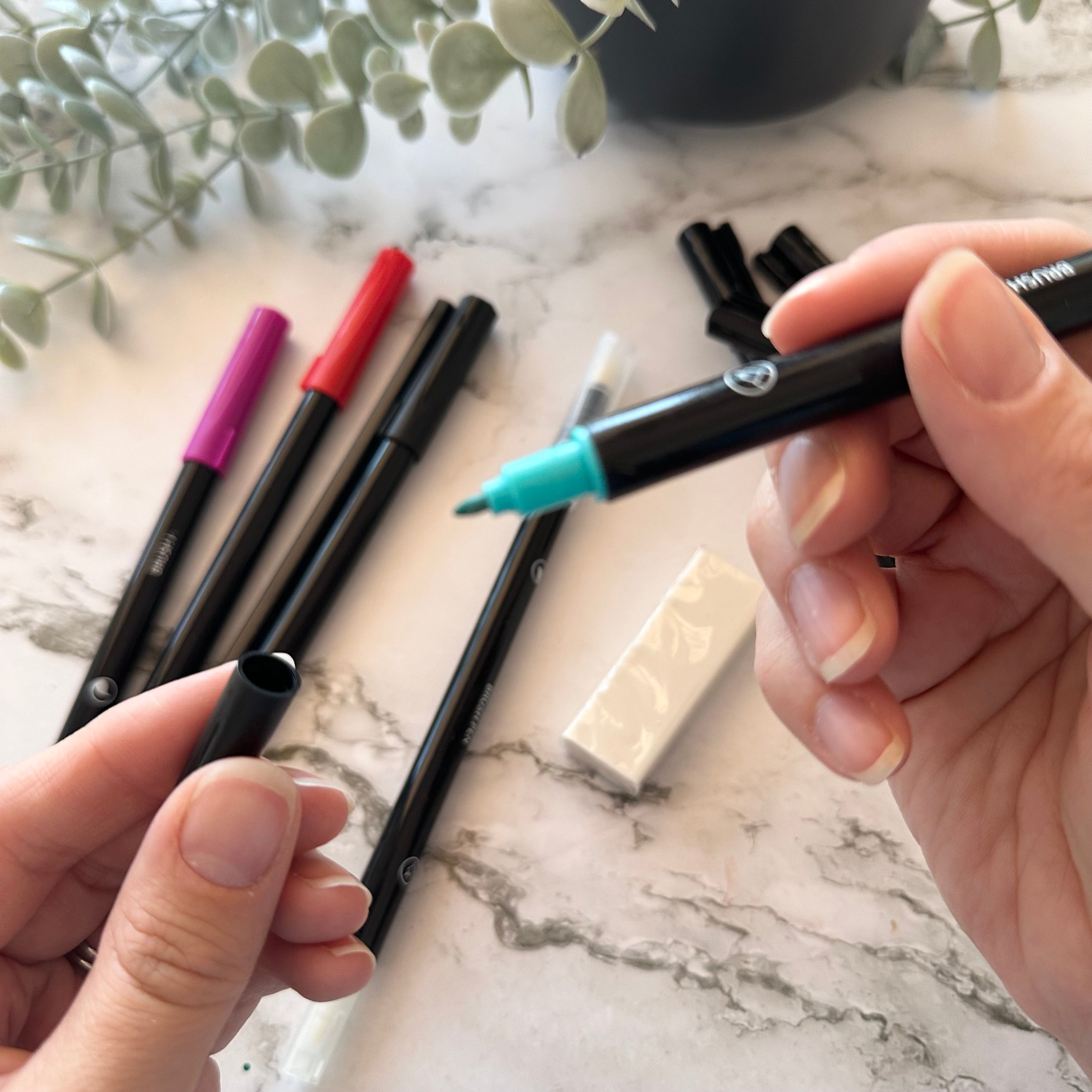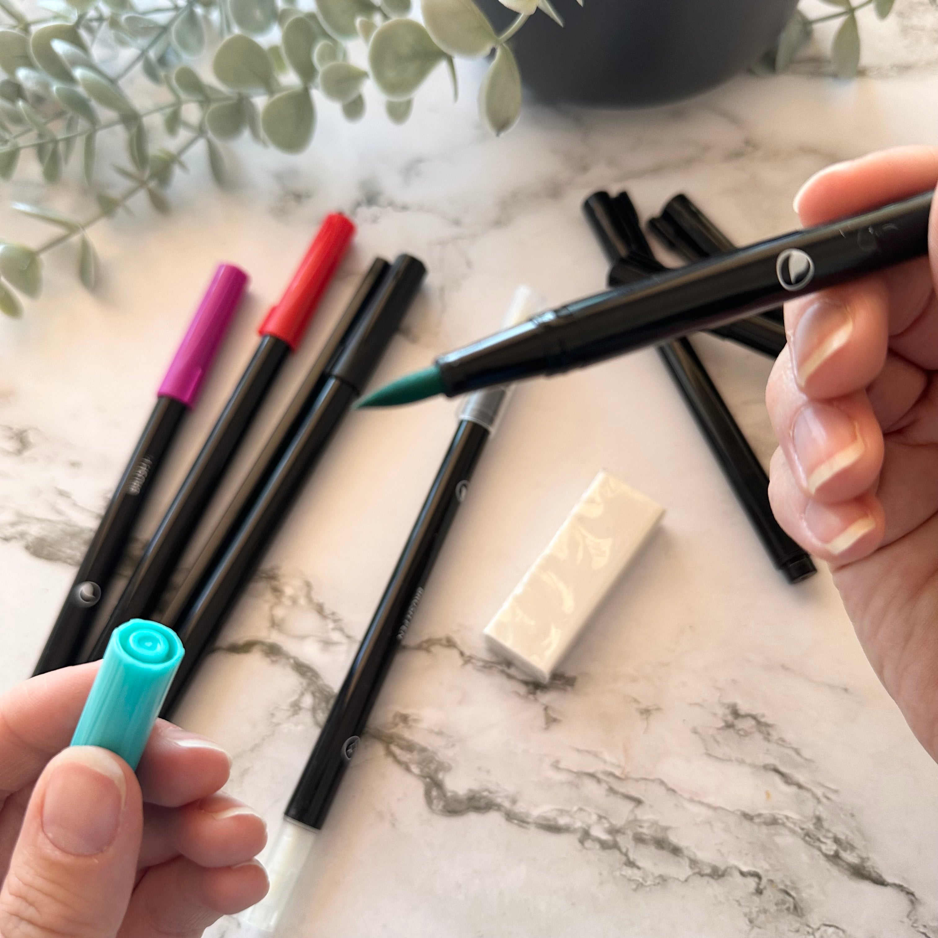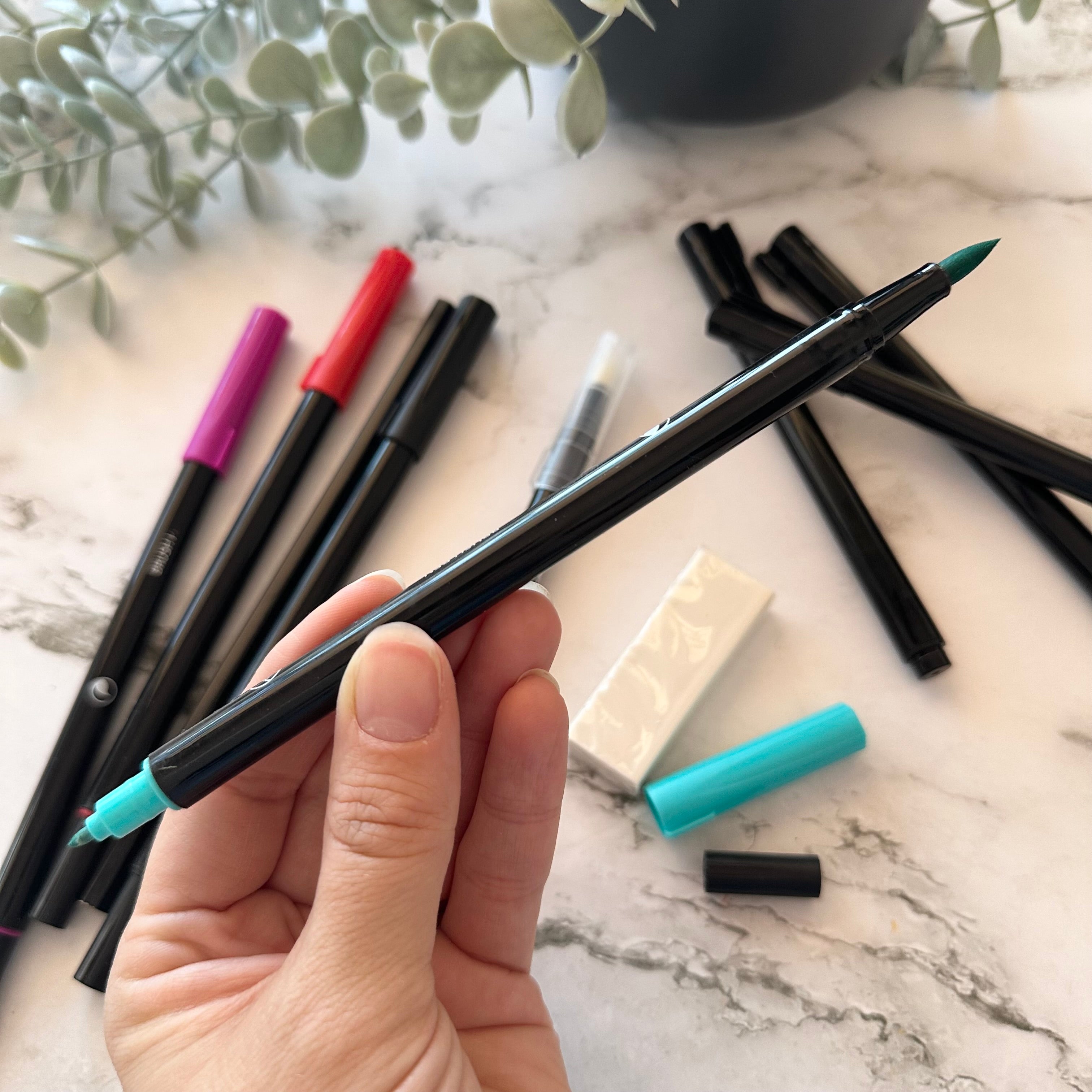 4 × Dual brush pens (black, red, magenta, turquoise)