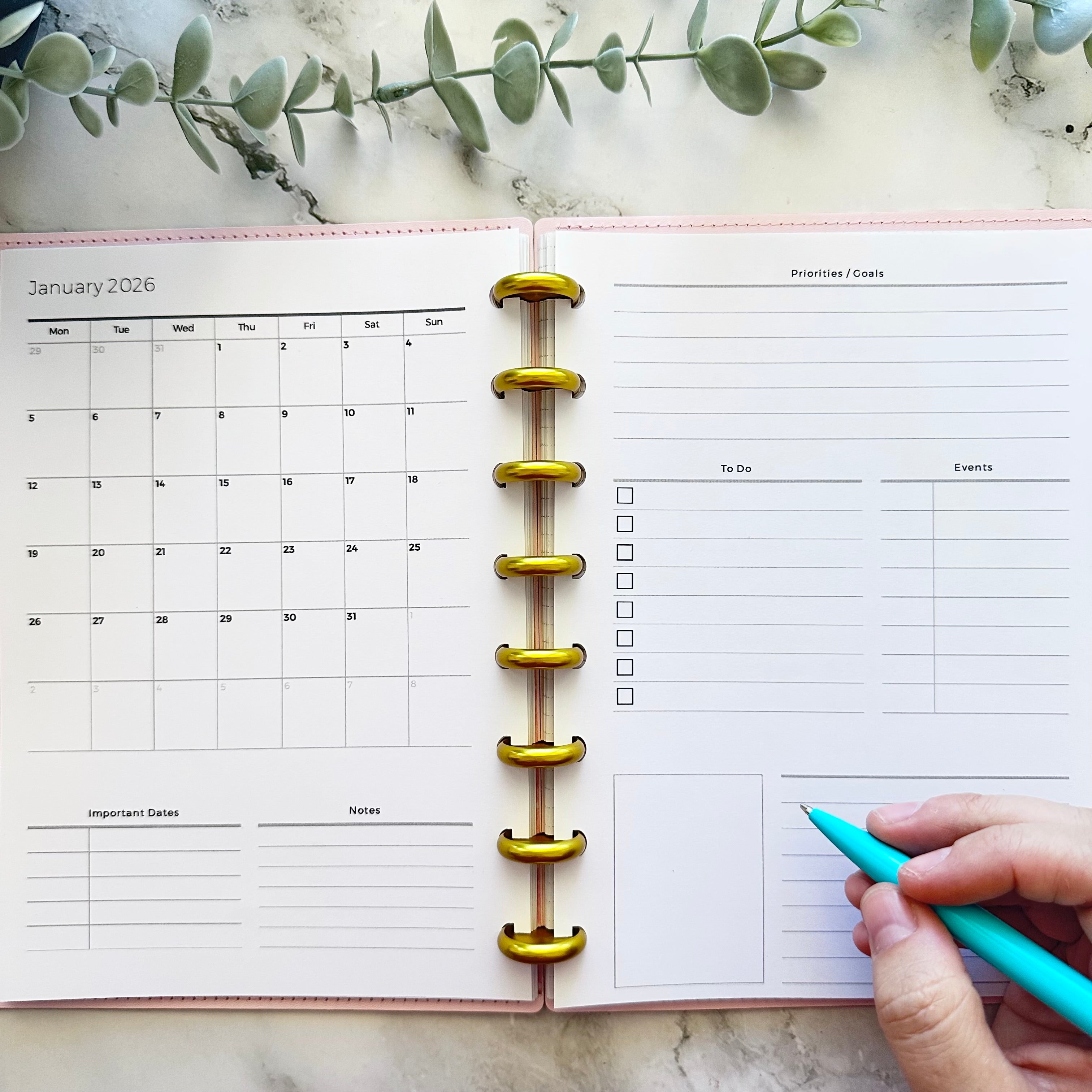 Includes space for important dates, priorities and goals, events, notes, and to-dos.