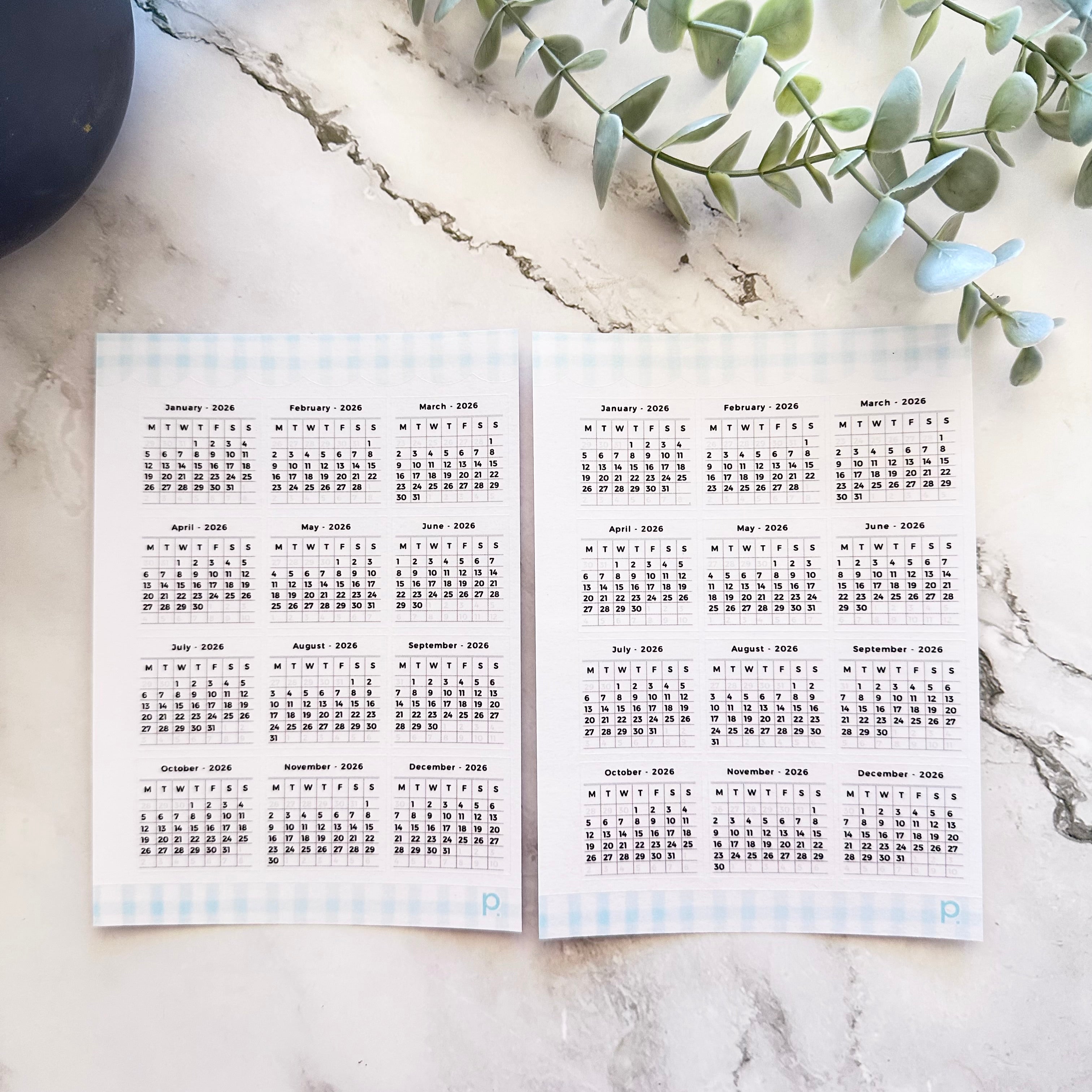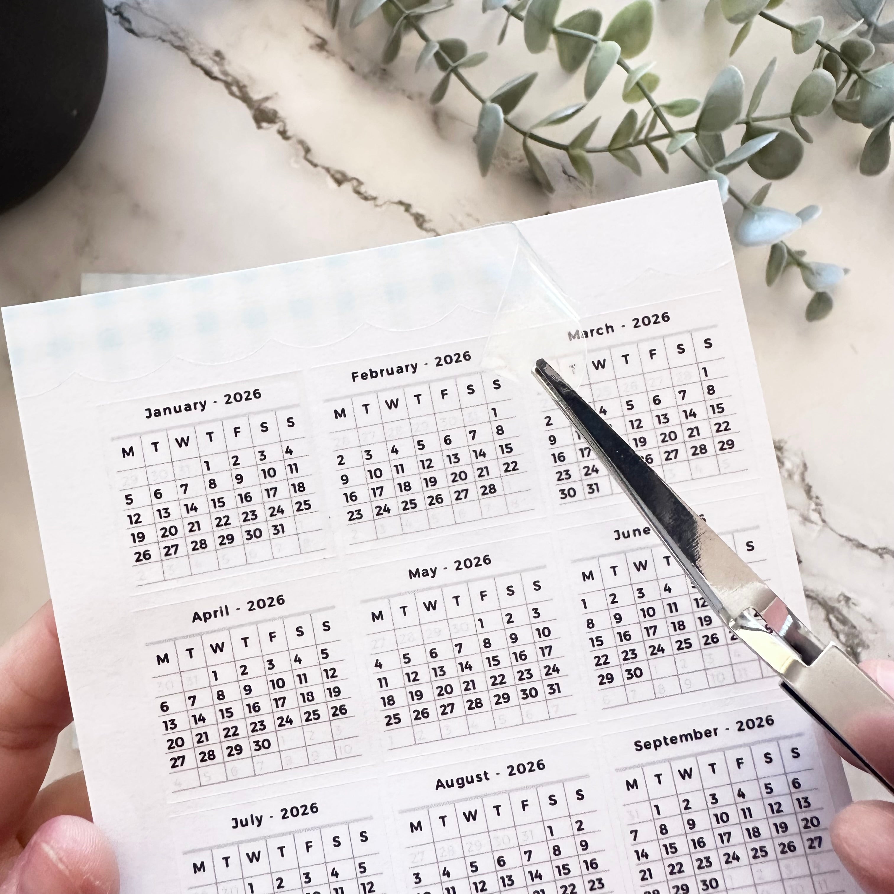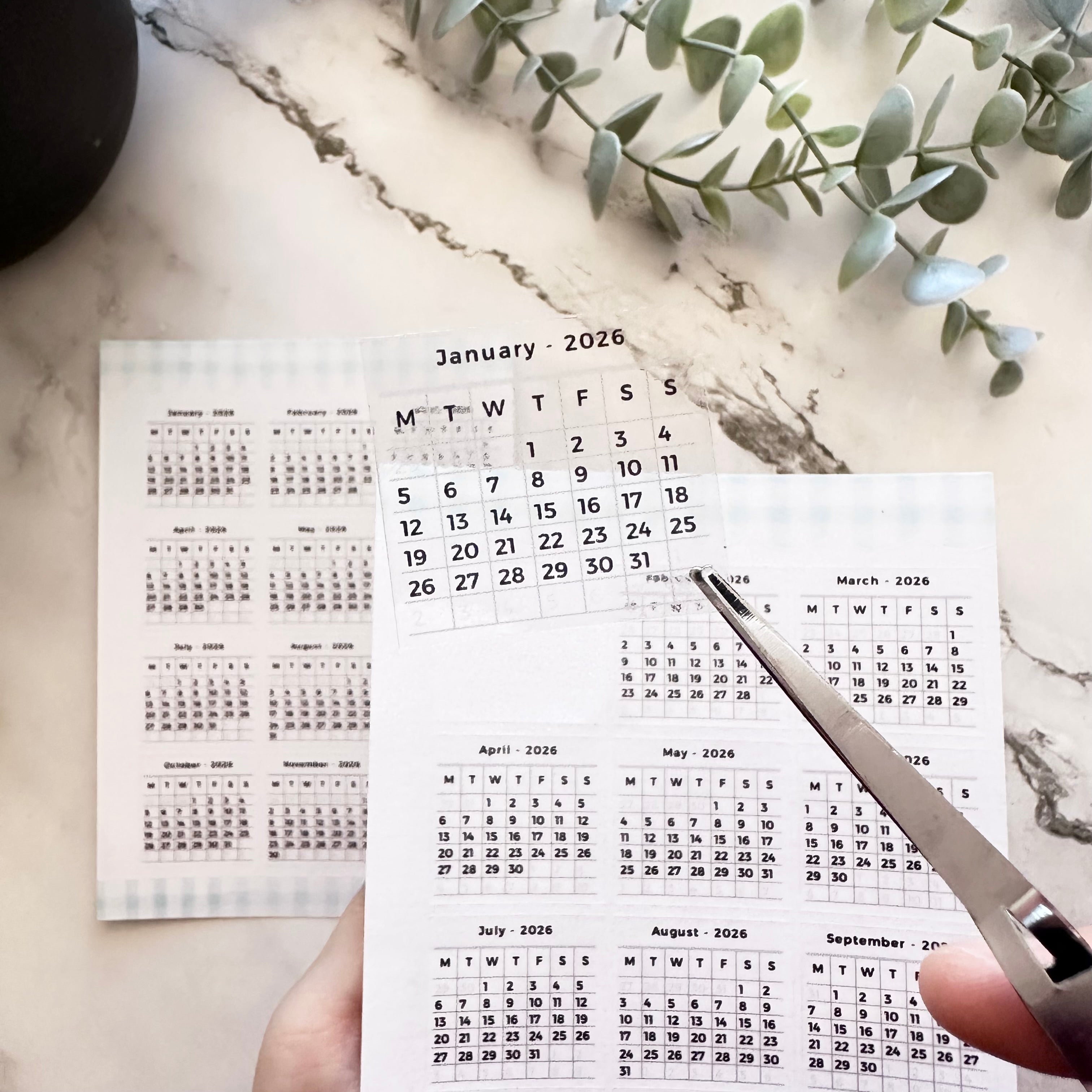 Printed on transparent sticker paper, they can be used on their own or layered over decorative pages, patterned paper, or washi tape. Each calendar measures approximately 3 × 3 cm, making them ideal for planners, dashboards, habit trackers, and journaling layouts. We’ve also left enough margin space on each side so you can hole punch the sheet to fit your discbound planner if you’d like to store them inside your system.