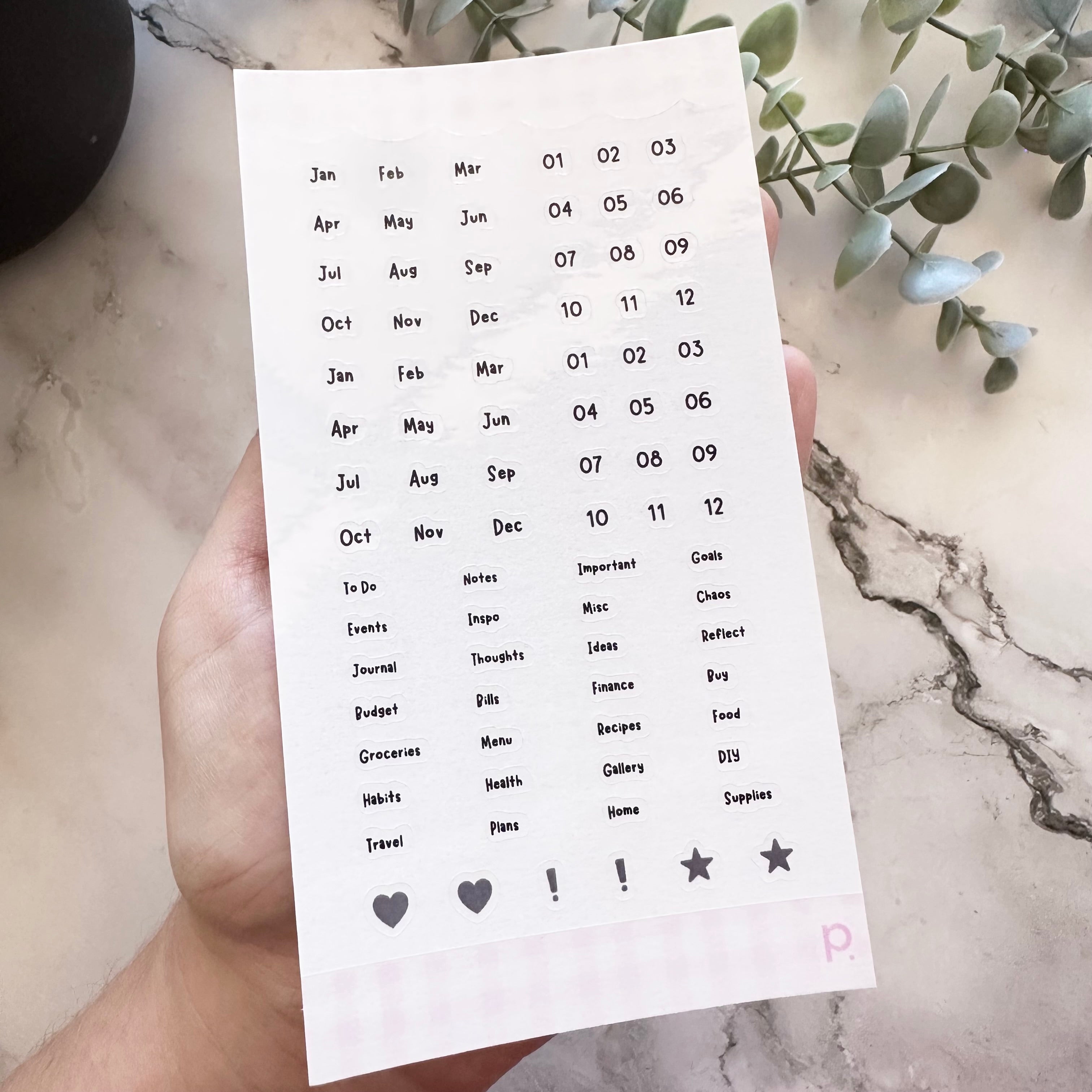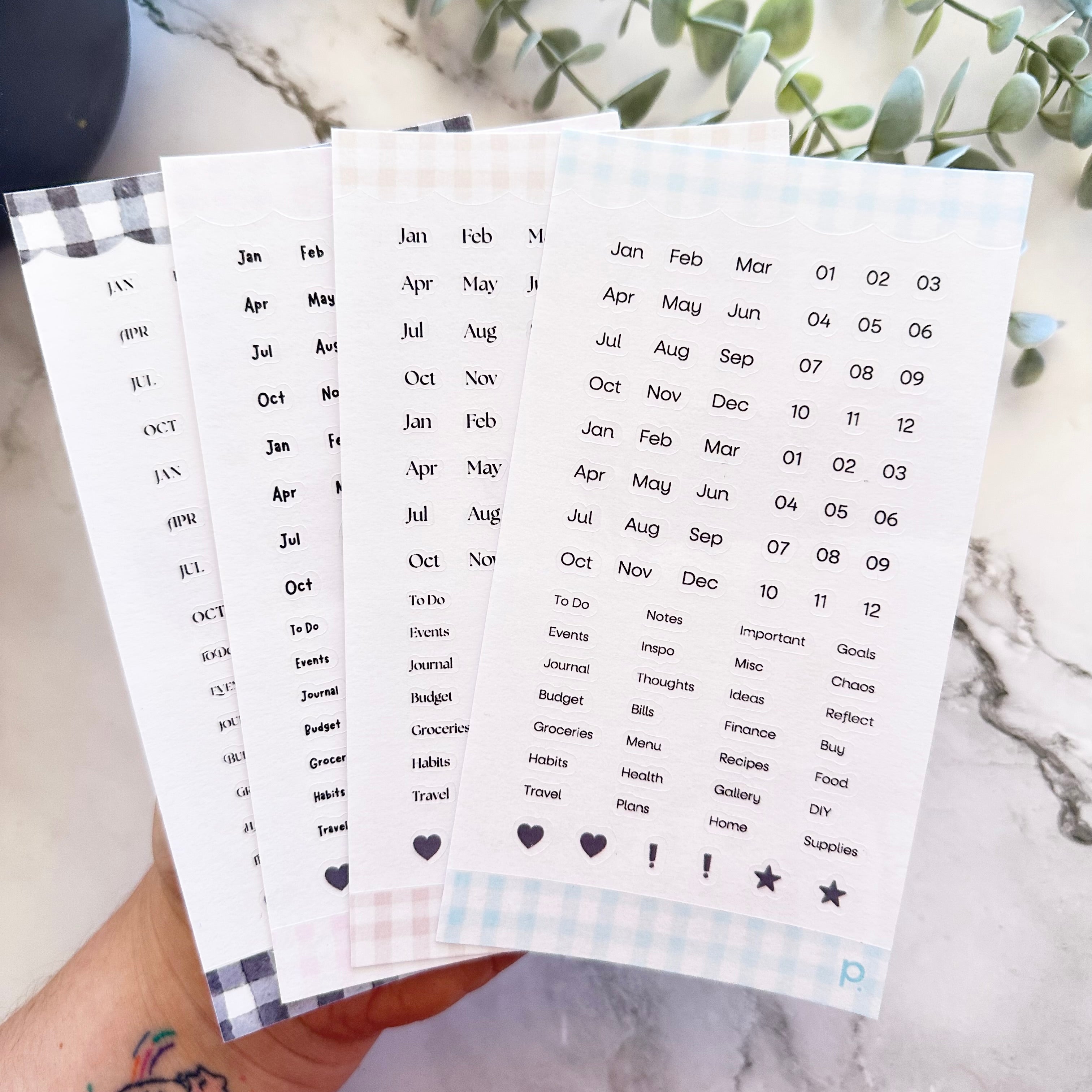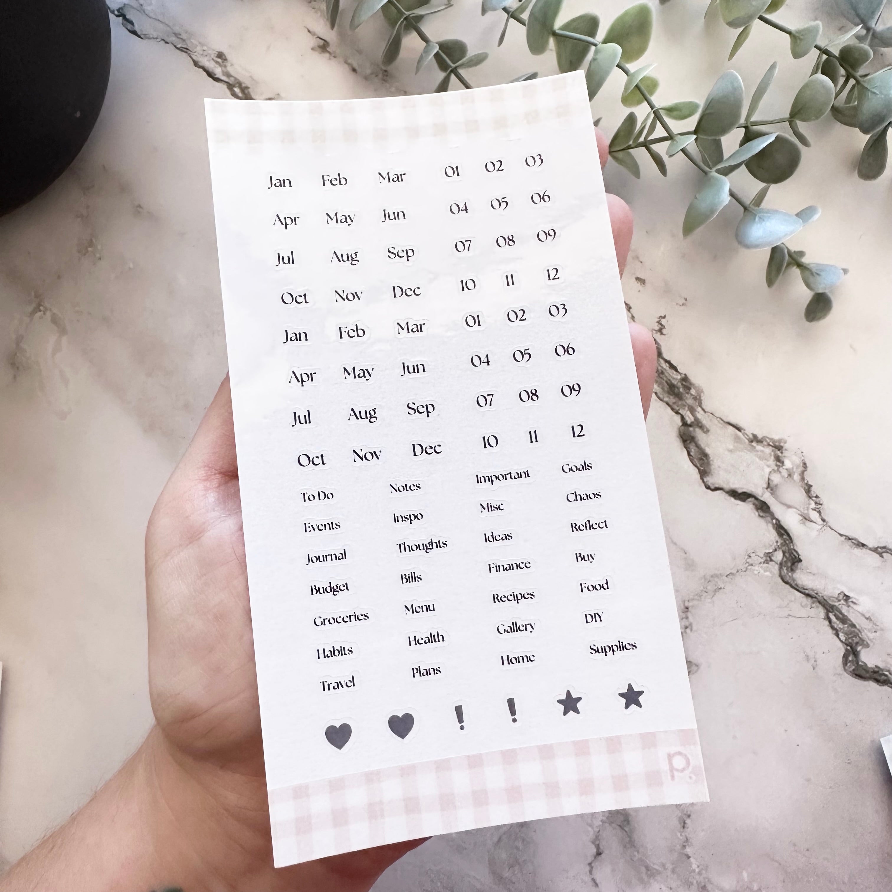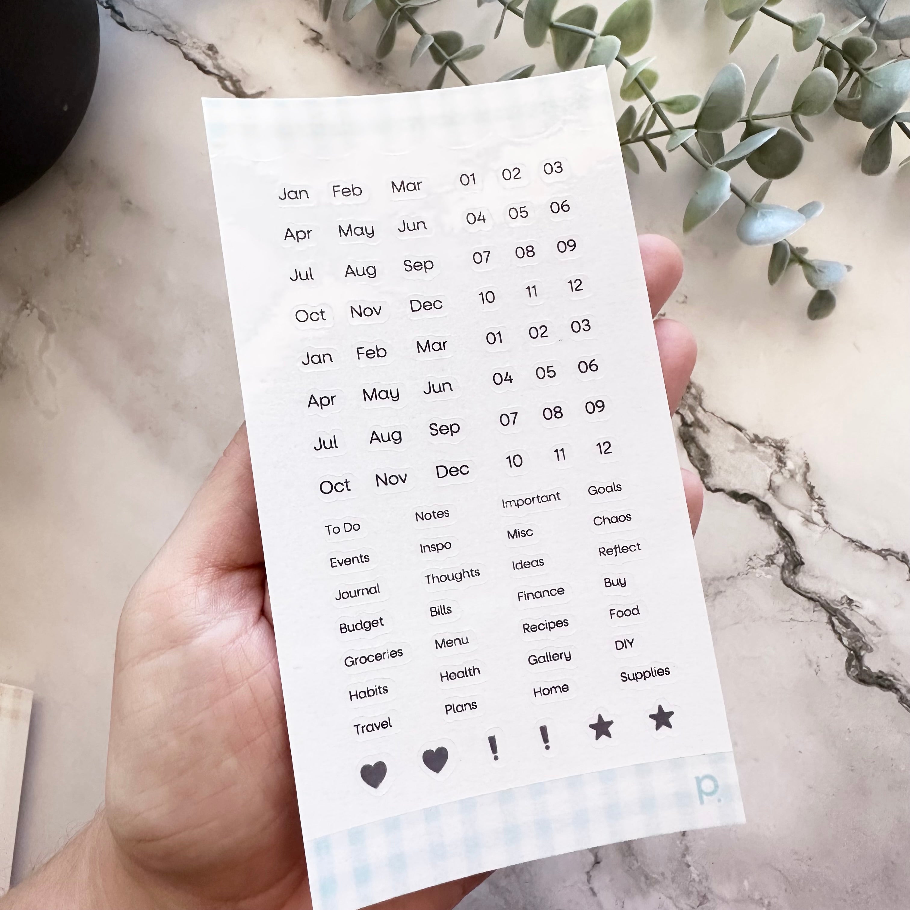 Printed on clear sticker paper, they blend neatly with your dividers for a clean, minimal look. With a variety of font styles available, you can choose a style that matches your planner aesthetic and setup. Each sheet includes a selection of tab labels covering common categories such as months, planner sections, and lifestyle themes, making them perfect for both functional planning and creative organisation.