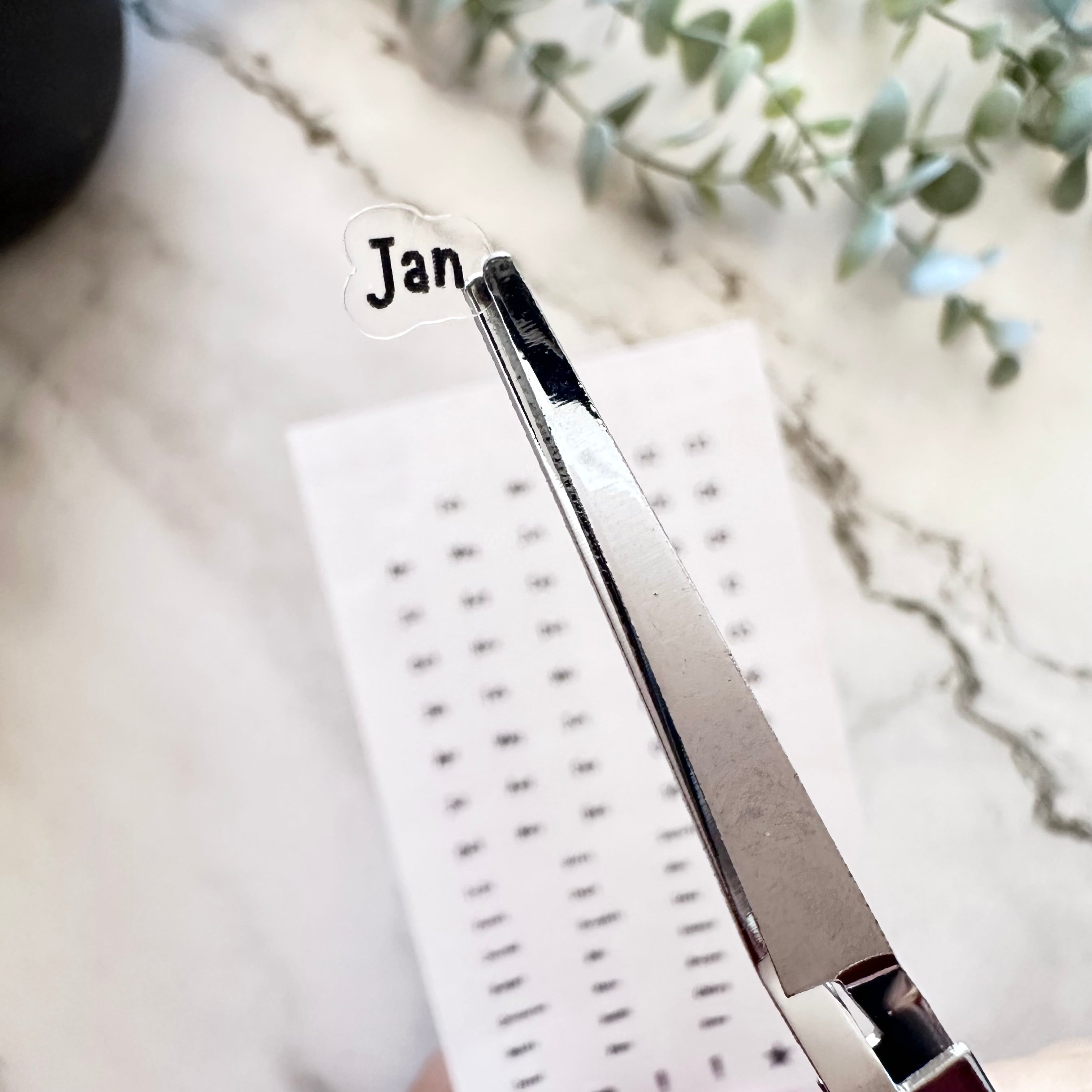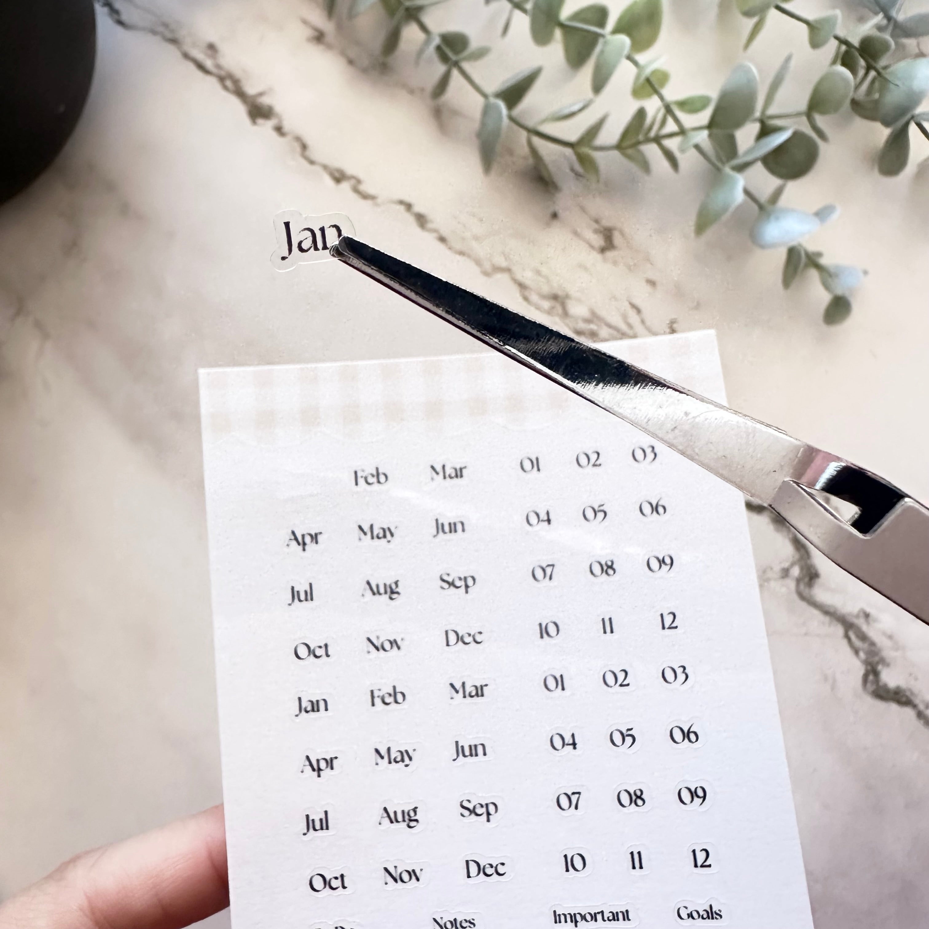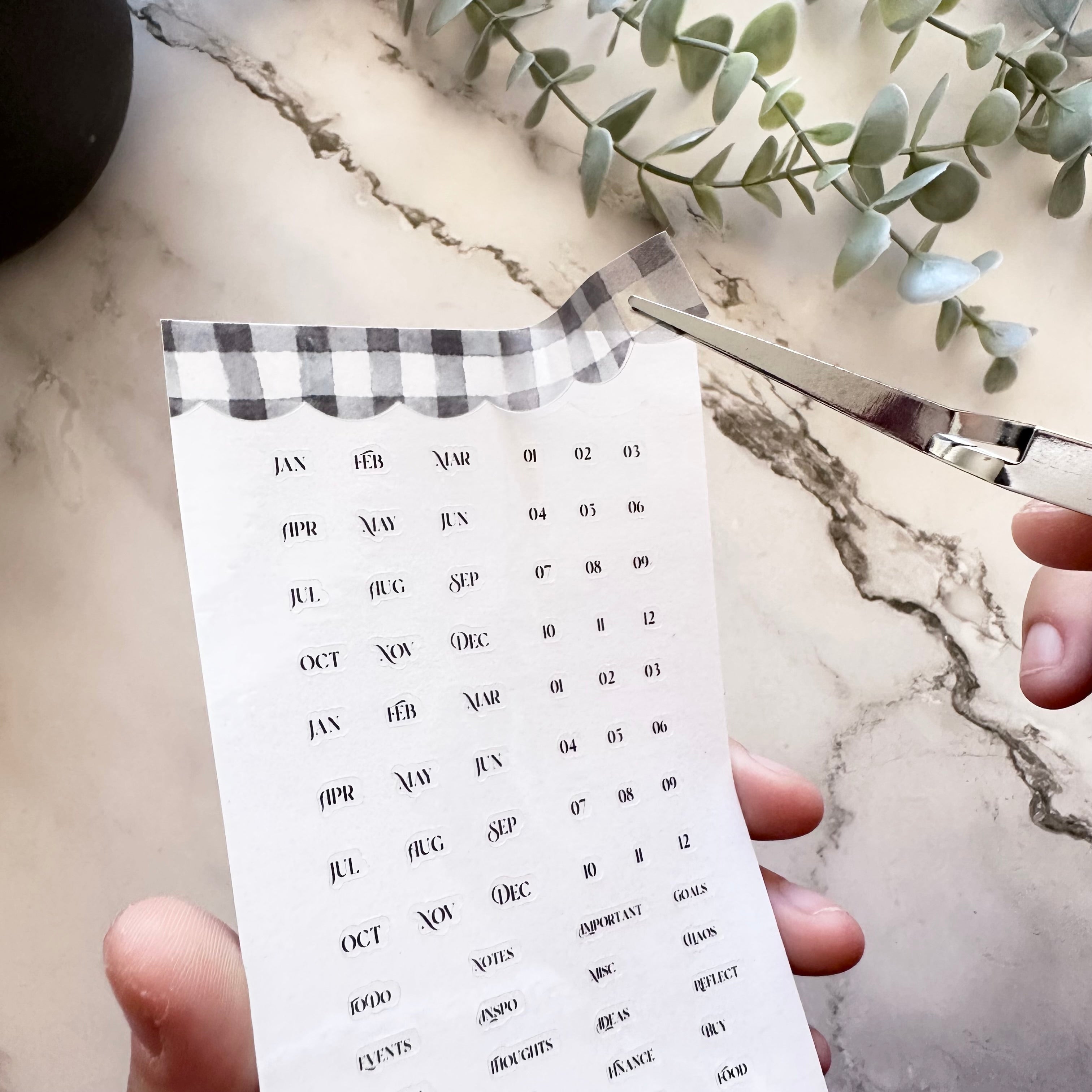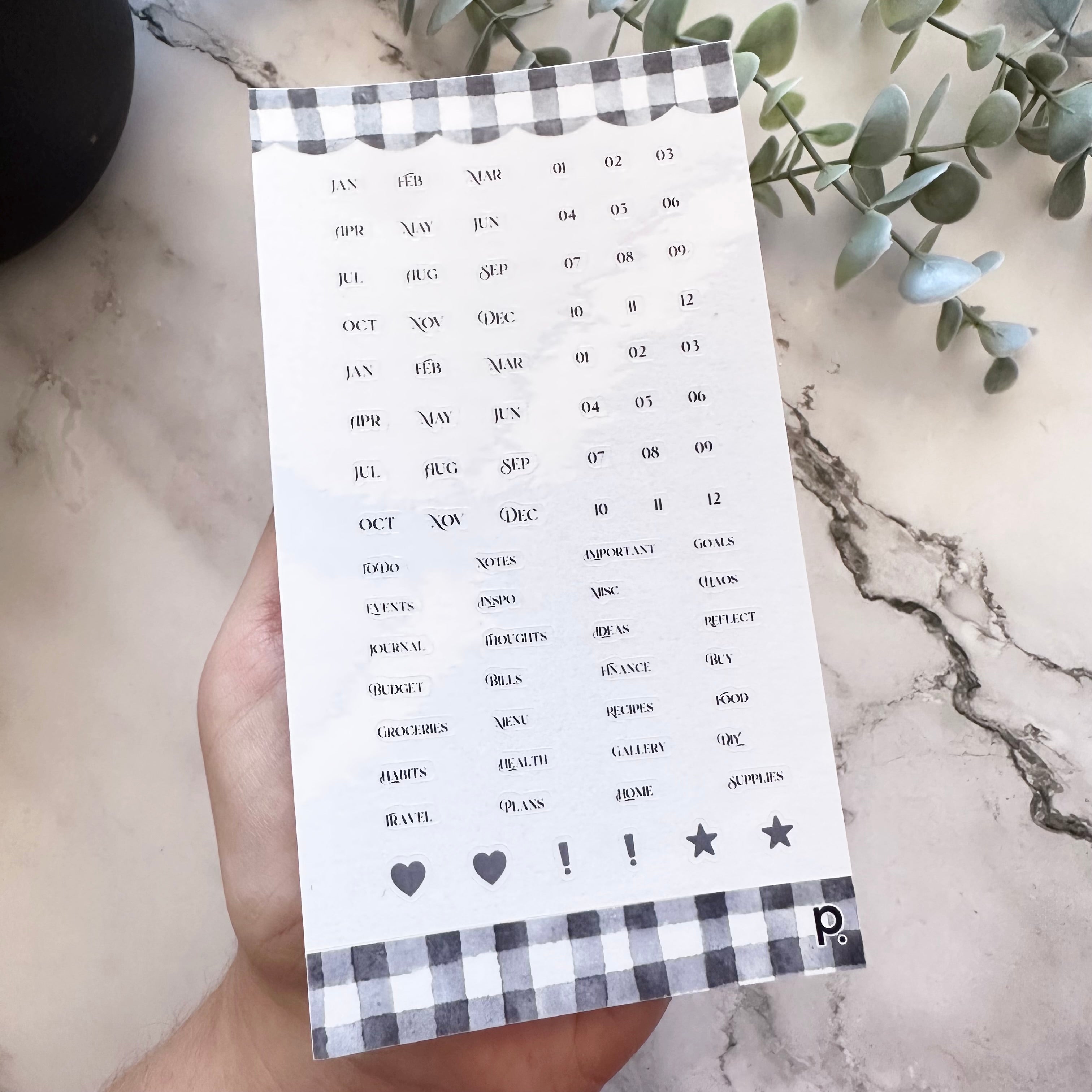 Printed on clear sticker paper, they blend neatly with your dividers for a clean, minimal look. With a variety of font styles available, you can choose a style that matches your planner aesthetic and setup. Each sheet includes a selection of tab labels covering common categories such as months, planner sections, and lifestyle themes, making them perfect for both functional planning and creative organisation.
